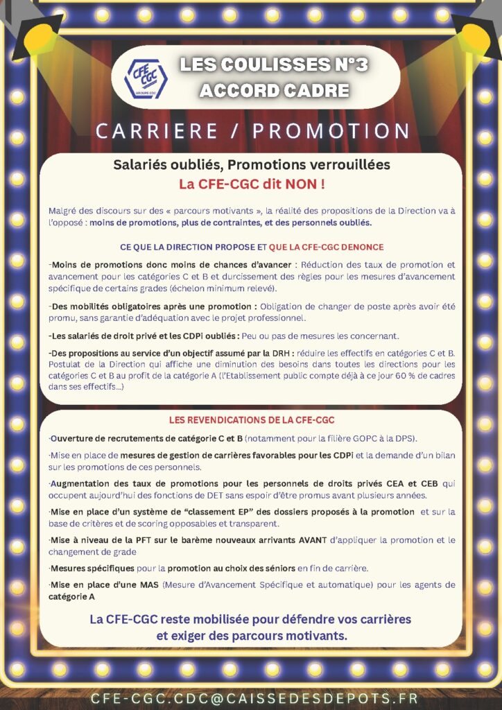 Les Coulisses #3 de l’Accord-Cadre : Carrière / Promotion 8 octobre 2025 La CFE-CGC reste mobilisée pour défendre vos carrières et exiger des parcours motivants Les coulisses n°3 de l’accord-cadre : Carrière et Promotion