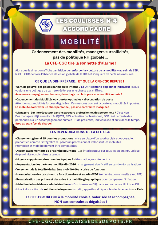 Les Coulisses #4 de l’Accord-Cadre : Mobilité 8 octobre 2025 La CFE-CGC dit OUI à la mobilité choisie, valorisée et accompagnée, NON aux contraintes déguisées ! Les coulisses n°4 de l’accord-cadre : Mobilité