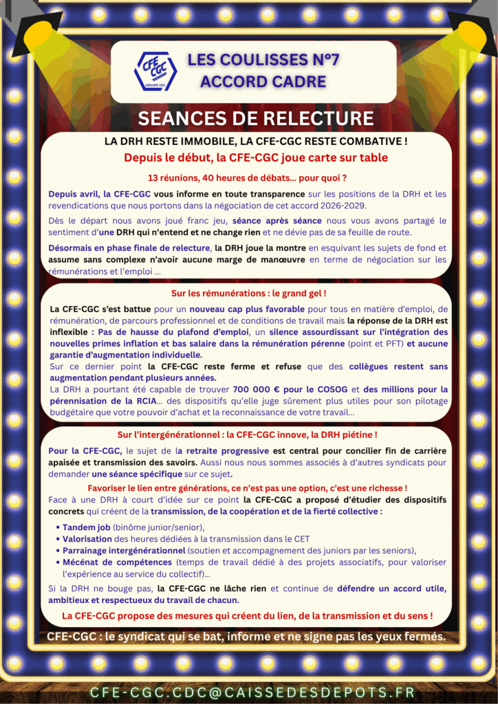 Les Coulisses #7 de l’Accord-Cadre : Séances de relecture 3 novembre 2025 La DRH reste immobile, la CFE-CGC reste combative ! Depuis le début la CFE-CGC joue carte sur table ! 3 réunions, 40h de débats… pour quoi ?