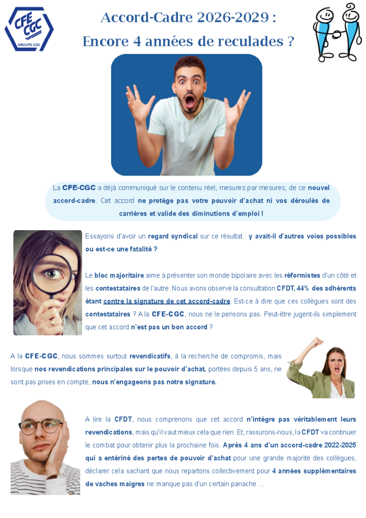 Accord-Cadre 2026 – 2029 : encore 4 années de reculades ? 22 janvier 2026 Si une majorité des organisations syndicales avait fait le choix de défendre le pouvoir d'achat, nous aurions obtenu collectivement gain de cause ! Accord-Cadre décembre 2025