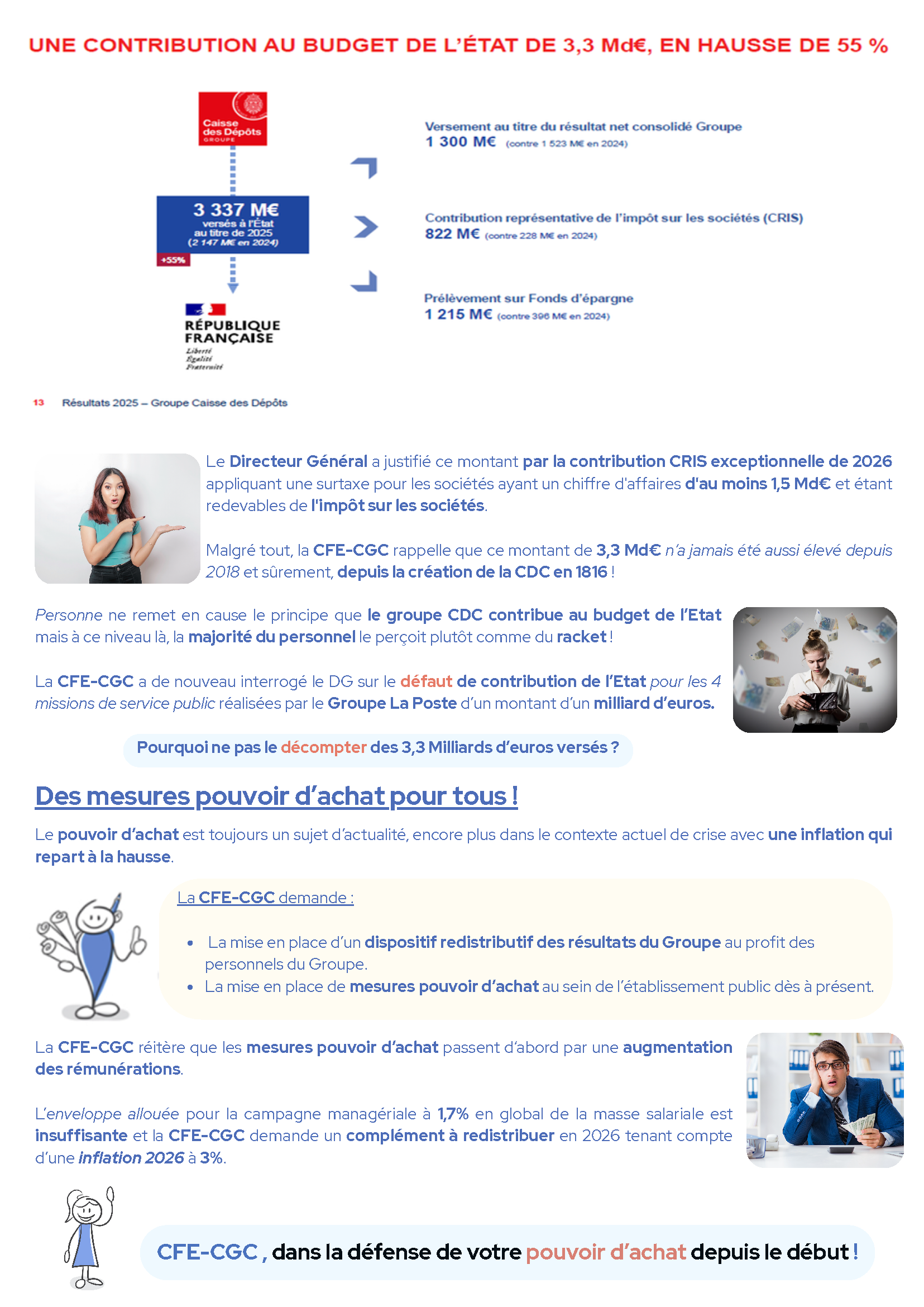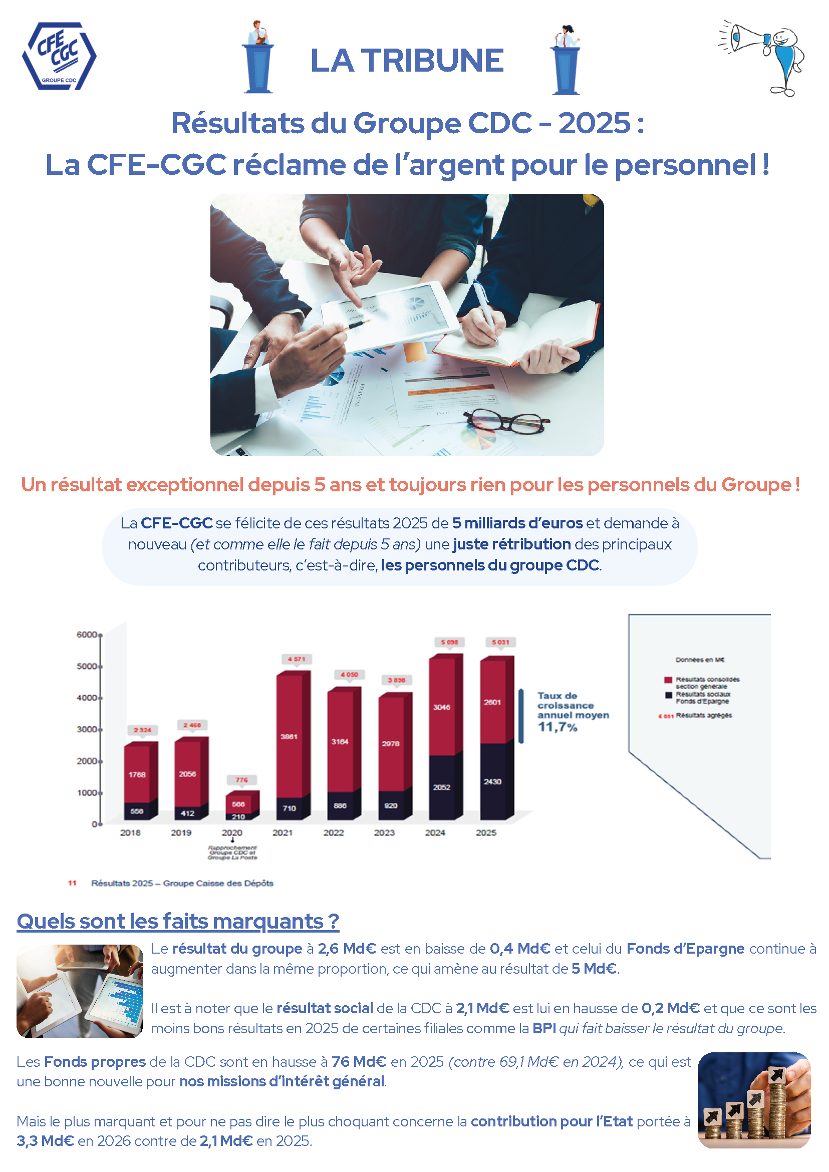 Résultats du Groupe CDC 2025 : la CFE-CGC réclame de l’argent pour le personnel ! 7 avril 2026 Des Résultats Exceptionnels de 5 MILLIARDS d'€uros en 2025 et toujours RIEN pour les personnels du Groupe ! Résultats du Groupe CDC en 2025 – PDF